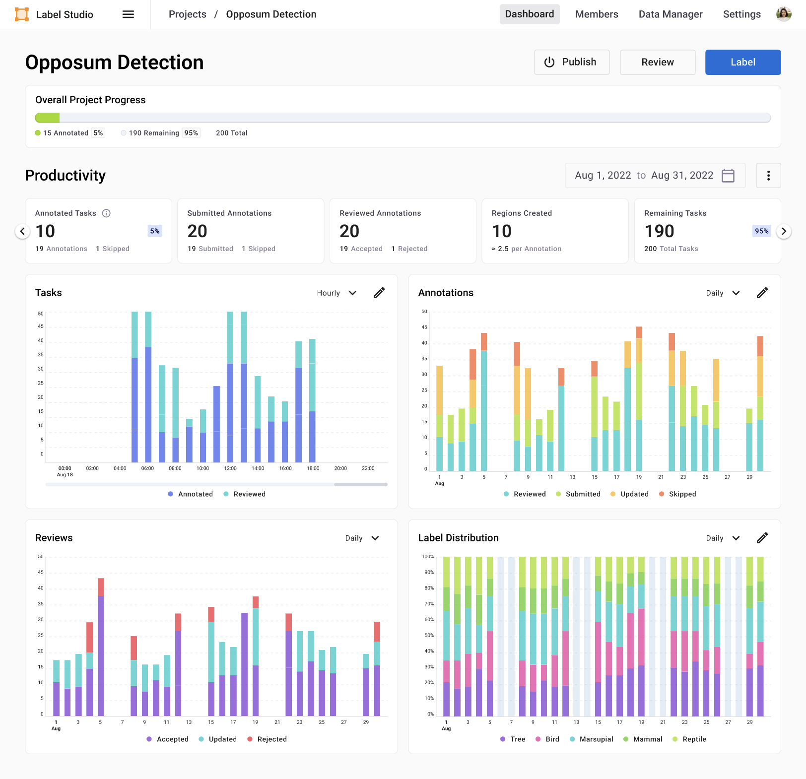 Navigate to your project’s Dashboard tab to discover the project’s progress at a holistic level and use the date time selector to discover trends for key performance indicators such as lead time or submitted annotations and to discover insights through time series charts for tasks, annotations, reviews, and label distributions.