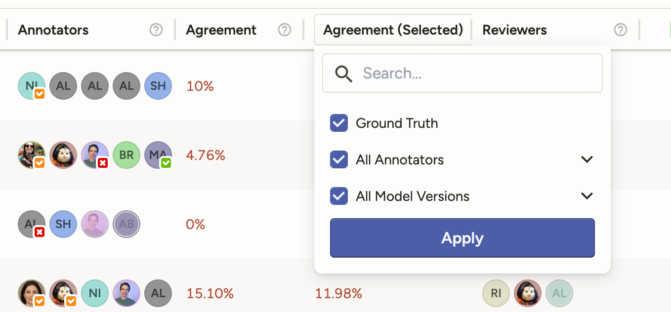 The agreement (selected) column builds on top of the agreement column, allowing you to get agreement scores between annotators, ground truth, and model versions. The column header is a dropdown where you can make your selection of what to include in the calculation.