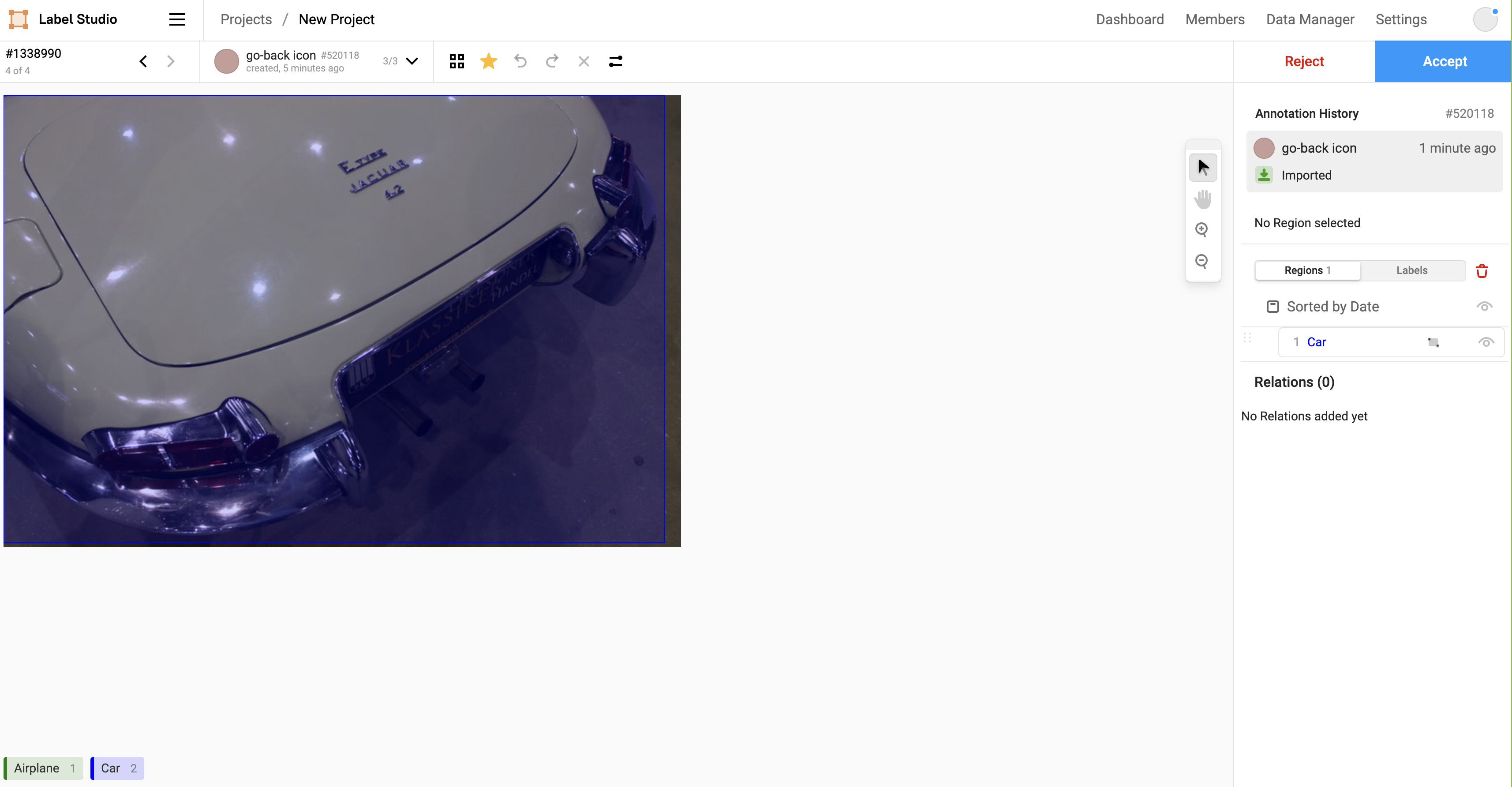 If the annotation is completely incorrect, or you don’t want to attempt to correct it at all, click Reject to reject the annotation. To place a rejected task back in the Label Stream for annotation, you must delete the annotation. Rejecting an annotation does not return it to annotators to re-label.