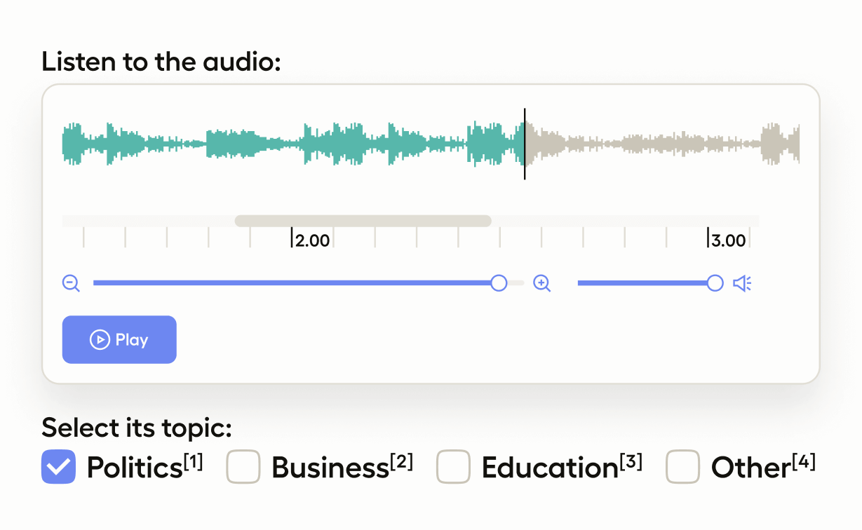 If you want to perform audio classification tasks, such as intent or sentiment classification, you can use this template to listen to an audio file and classify the topic of the clip.