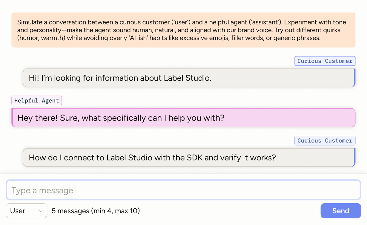 • messageroles: The annotator will see a drop-down menu with user and assistant roles that they can choose from when sending messages.