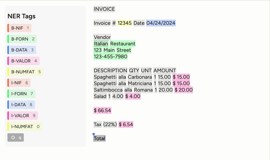 This labeling config enables Named Entity Recognition (NER) on invoice documents using the BIO (Beginning, Inside, Outside) format. It combines OCR text recognition with entity tagging for key invoice elements.